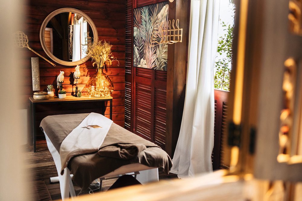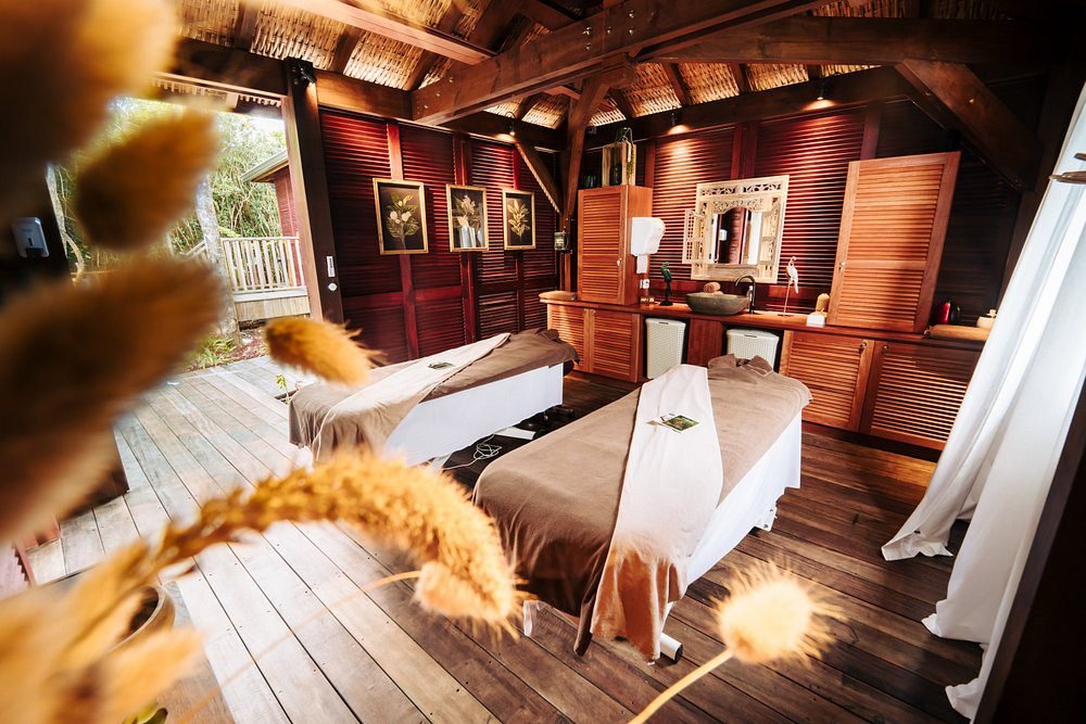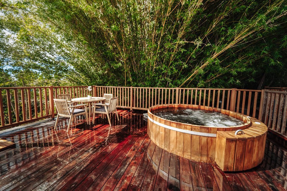Les hôtes se retrouvent près de la cheminée ou se rendent au spa panoramique en pleine forêt, où sauna, jacuzzi en plein air et douche balinaise invitent à une profonde détente.