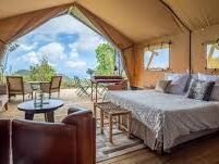 Chaque tente de glamping couvre 35 mètres carrés et est conçue pour offrir le confort d’un hôtel boutique tout en conservant la sensation d’être proche de la nature. L’espace comprend une chambre douillette avec un lit queen-size et la possibilité d’un lit bébé pour les petits enfants, un coin salon pour la détente, ainsi qu’un dressing pour plus de commodité. La salle de bain dispose d’une douche moderne intégrée, et les toilettes sont séparées pour plus d’intimité.